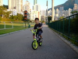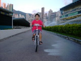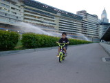 長男(温)より一年早く補助輪なしの自転車に乗れるようになった次男(善)。この自転車にはブレーキがないので、下り坂を走っているときは怖い模様。自転車で走っているのは自宅のそばにあるハッピーバレー競馬場の中のジョギングコース。