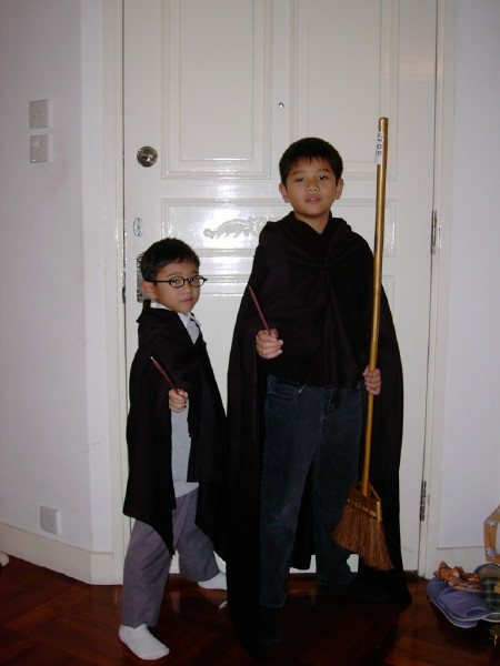 子供たちは大喜びで準備にいそしみました。結局、善がハリーポッターになり、温はハリーの学校の黒装束の先生、プロフェッサー・スネイプになることに。二人からもいろいろアイデアが出るし、スプレーペンキを塗っただけで尊敬されるし、ワイワイガヤガヤと楽しい夜が3晩続きました。その間、善はレンズを外したメガネを片時も離さず鼻に跡が付くほどでした。当日は私のリップペンシルで例の傷跡を額に描き込み、二人ともすっかりその気になって10ドルのほうきにまたがって登校していきました。さすがにほうきまで持ってきたのは全校で西蘭家だけだったそうです。